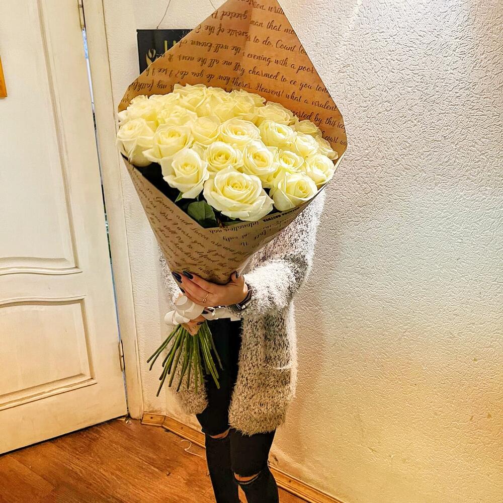 розы эквадор белые – 27 шт.Крафт упаковка – 2 шт.Лента атласная – 1 шт.