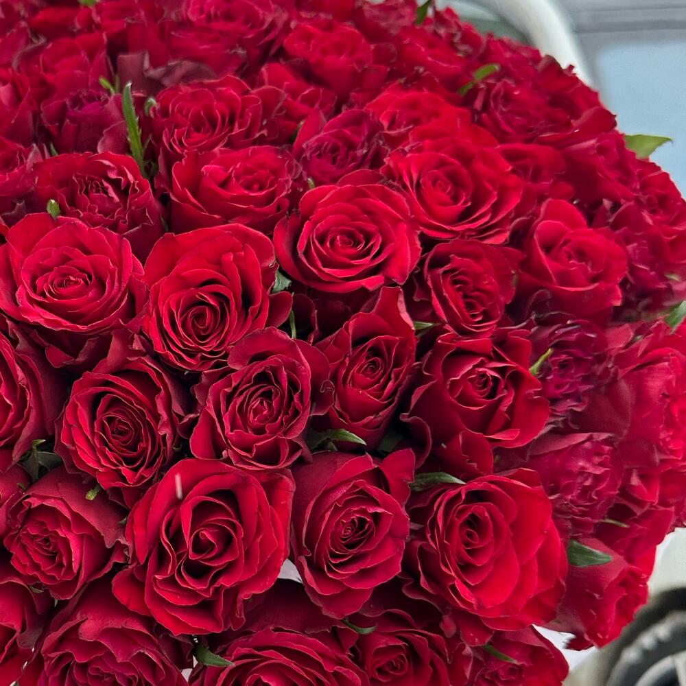 Роза красная – 45 шт.Лента атласная – 1 шт.Коробка шляпная – 1 шт.