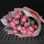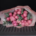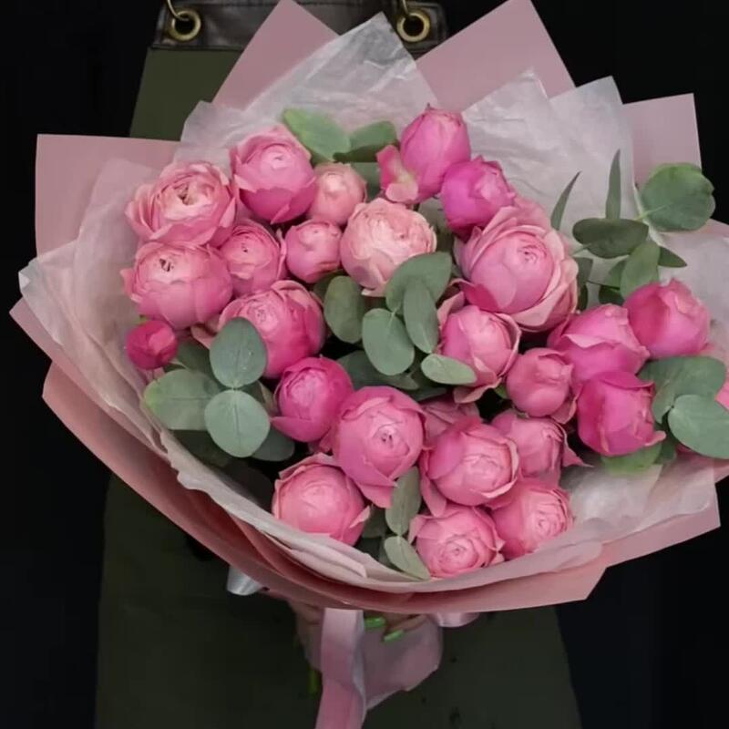 Эвкалипт – 3 шт.Лента атласная – 2 шт.Пленка матовая – 3 шт.Тишью белое – 3 шт.роза пионовидная сильва пинк – 9 шт.