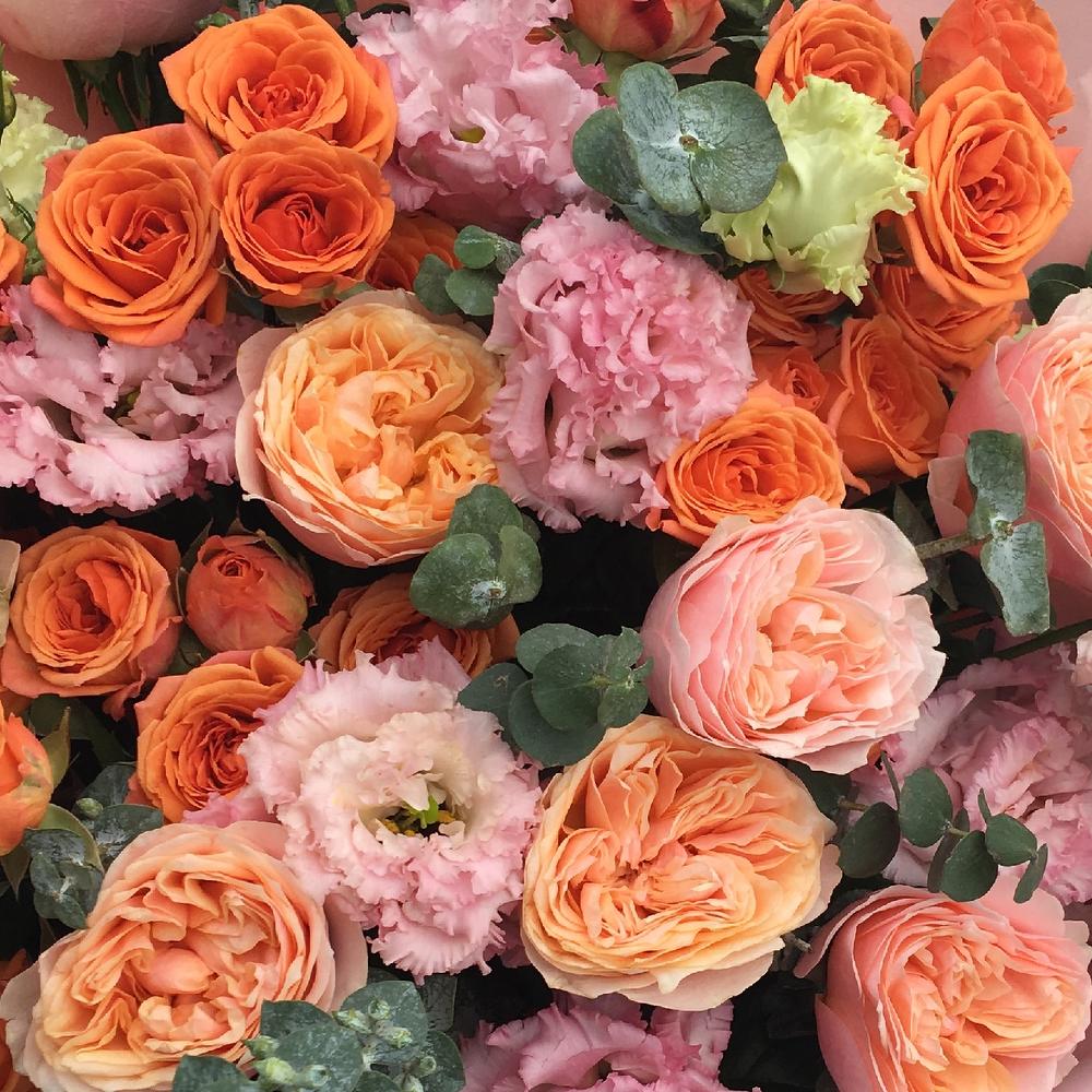 Роза пионовидная – 9 шт.Роза кустовая – 5 шт.Лизиантус – 9 шт.Эвкалипт – 9 шт.Упаковка – 3 шт.Лента атласная – 2 шт.