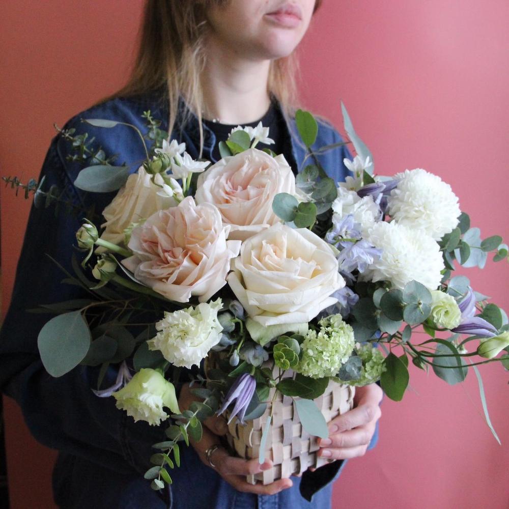 Хризантема – 2 шт.Роза пионовидная – 5 шт.Клематис – 2 шт.Нарцисс – 3 шт.Лизиантус – 3 шт.Вибурнум – 2 шт.Эвкалипт – 5 шт.Лукошко – 1 шт.Оазис флористический – 1 шт.