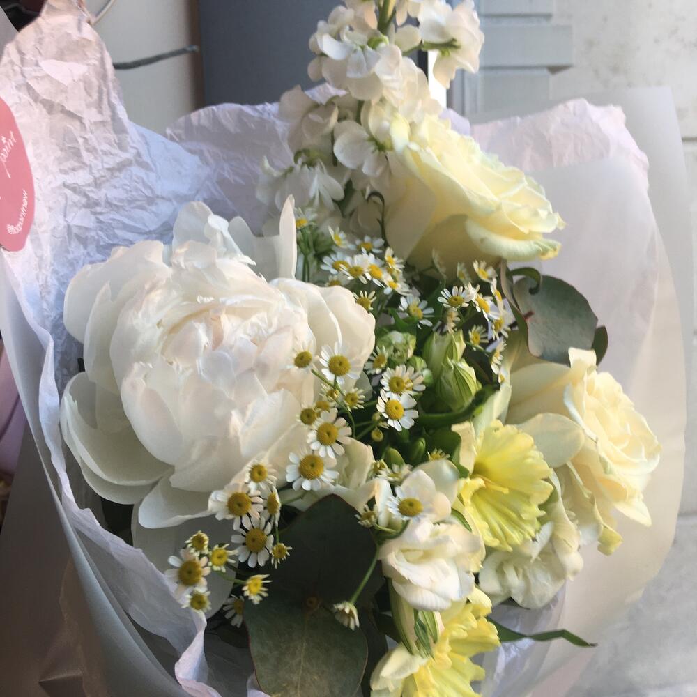 Пион – 1 шт.нарциссы – 2 шт.Роза – 2 шт.Альстромерия – 1 шт.Маттиола – 1 шт.Танацетум – 2 шт.Фрезия – 2 шт.Зелень – 1 шт.Упаковка дизайнерская – 1 шт.