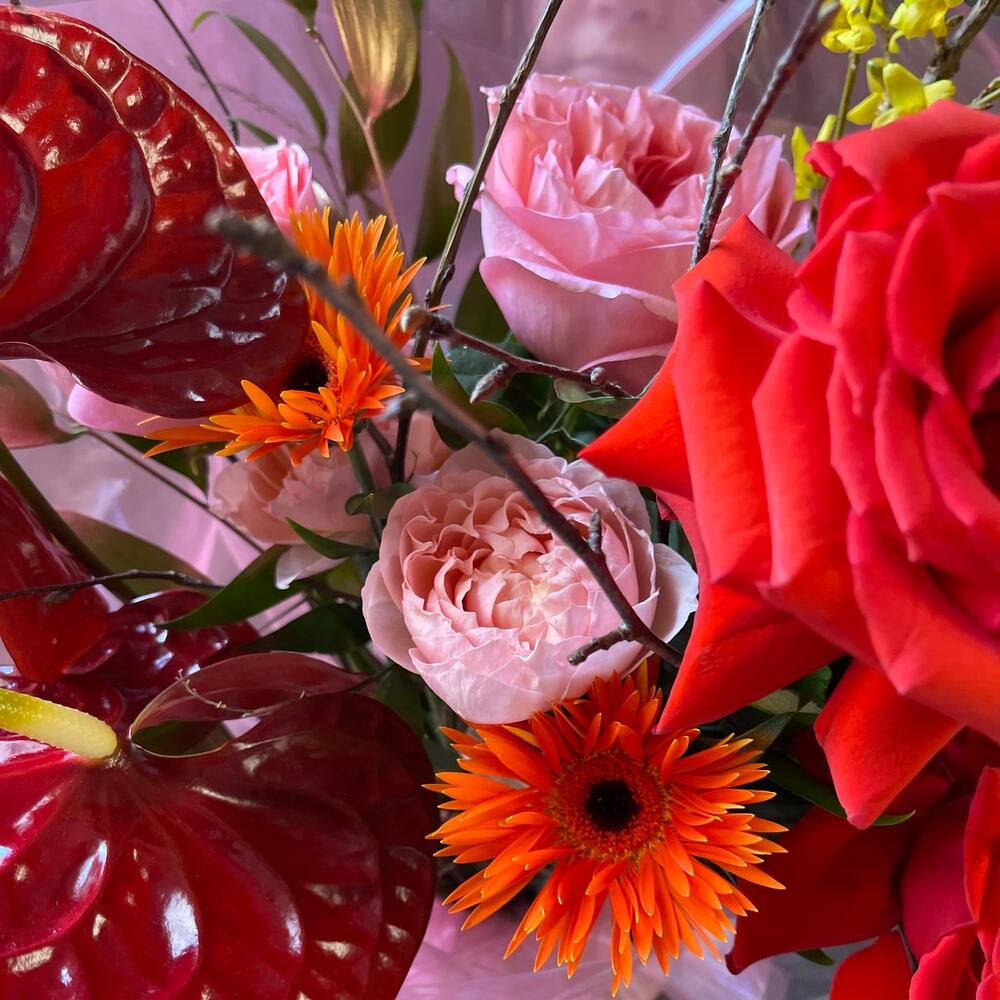 Пионовидная роза – 5 шт.Антуриум – 2 шт.Гербера сортовая – 3 шт.Форзиция – 1 шт.Краспедия – 2 шт.Зелень – 5 шт.Роза кустовая пионовидная – 1 шт.Упаковка дизайнерская – 3 шт.