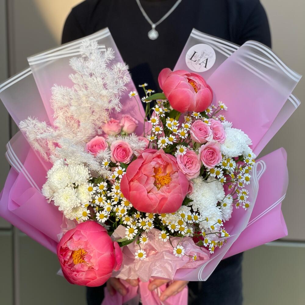 Пион – 3 шт.Хризантема кустовая – 3 шт.Кустовая роза – 2 шт.Лента атласная – 1 шт.Тишью – 1 шт.Ромашка кустовая – 5 шт.Упаковка дизайнерская – 4 шт.Аспарагус Умбелатус – 1 шт.