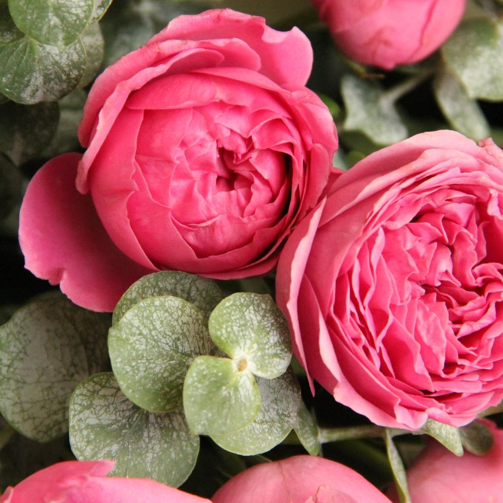 Роза кустовая пионовидная – 9 шт.Эвкалипт – 5 шт.Упаковка – 3 шт.Лента атласная – 2 шт.