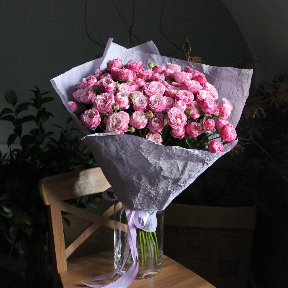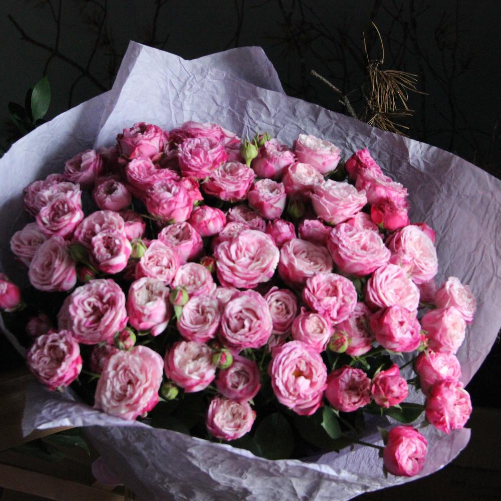 Роза кустовая пионовидная – 15 шт.Упаковка мятый крафт – 3 шт.Лента атласная – 2 шт.