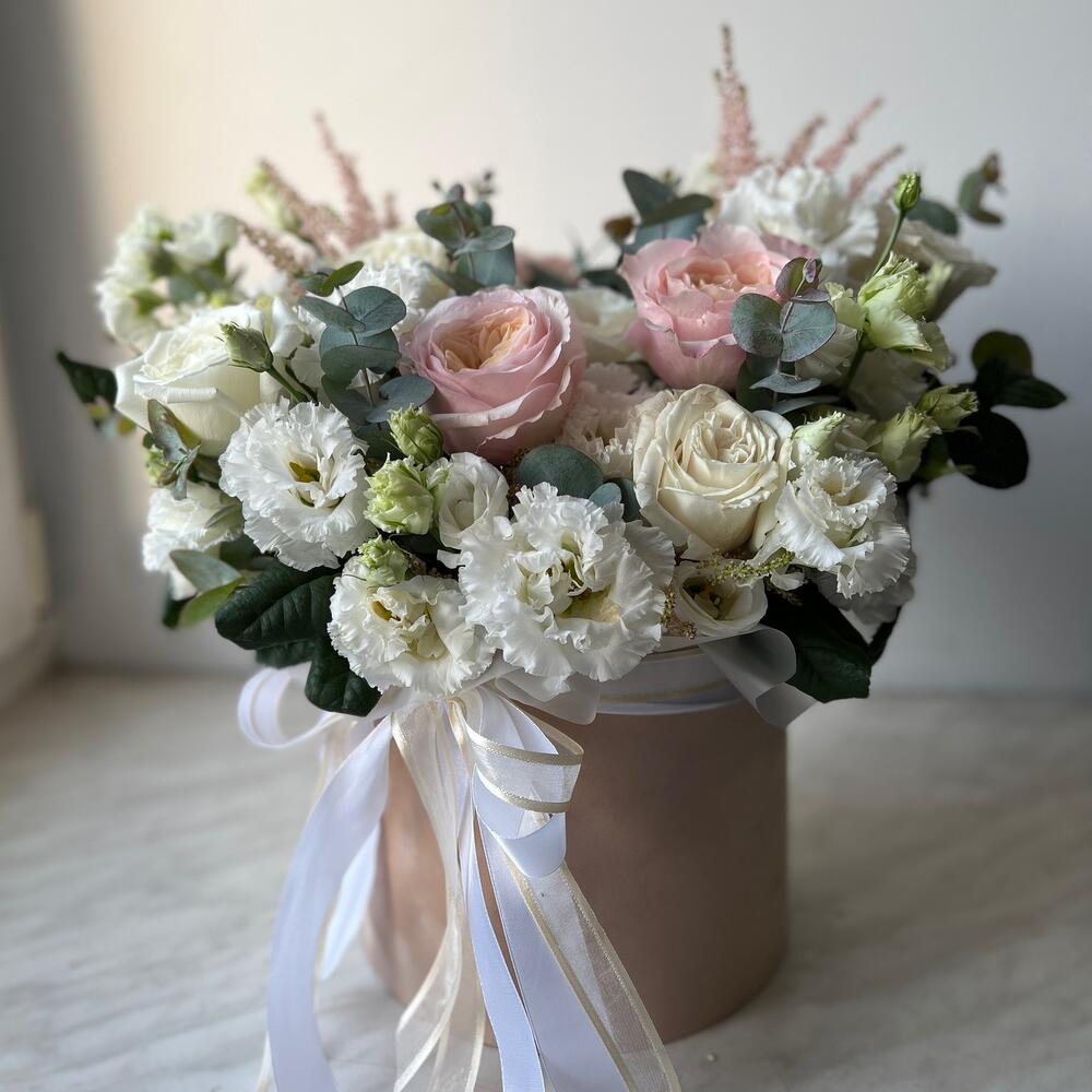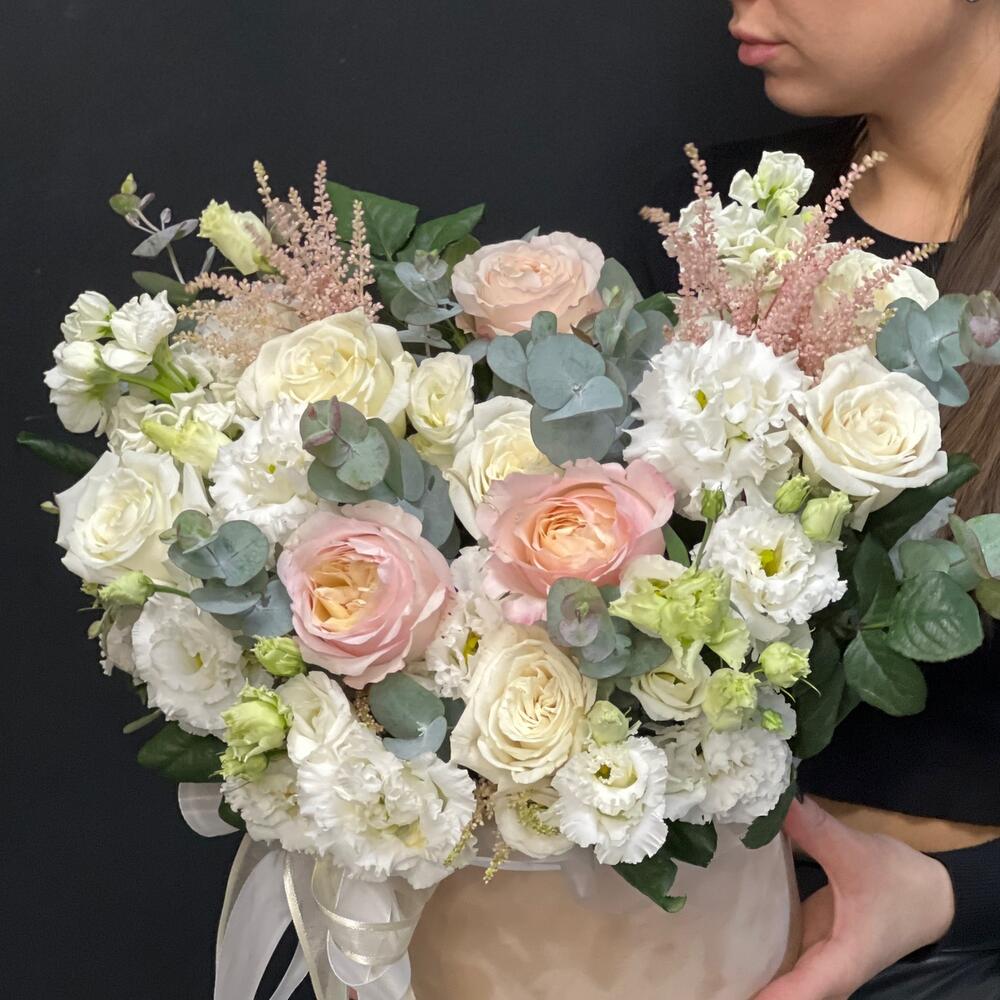 роза садовая дэвид остина – 3 шт.роза пионовидная плайа бланка – 5 шт.Астильба – 2 шт.Эустома белая махровая – 4 шт.эустома розита вайт – 1 шт.Маттиола – 2 шт.Эвкалипт – 3 шт.Оазис флористический – 1 шт.Коробка шляпная – 1 шт.Лента атласная – 2 шт.