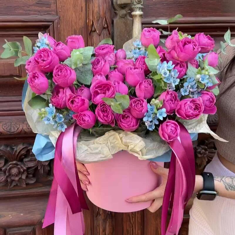 Эвкалипт – 3 шт.Лента атласная – 6 шт.Тишью – 1 шт.Коробка шляпная – 1 шт.Оксипеталум – 7 шт.Пленка матовая – 1 шт.Оазис флористический – 1 шт.роза кустовая мисти бабл – 11 шт.