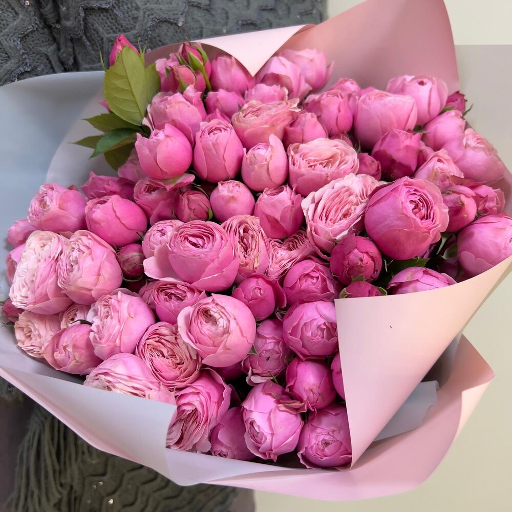 Пионовидная кустовая роза – 19 шт.Упаковка розовая – 2 шт.упаковка серая – 2 шт.