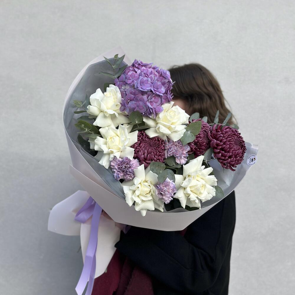Гортензия – 1 шт. Роза – 5 шт. Гвоздика – 3 шт. Хризантема – 3 шт. Эвкалипт – 2 шт.
