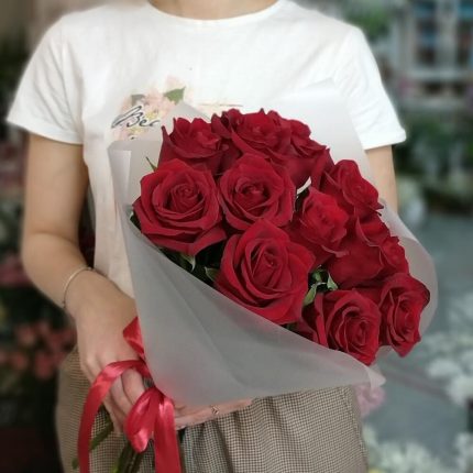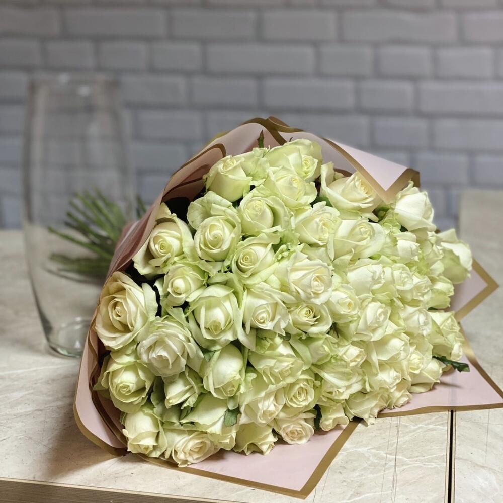 роза украинская белая – 51 шт. оформление калька – 1 шт. Стеклянная ваза – 1 шт.
