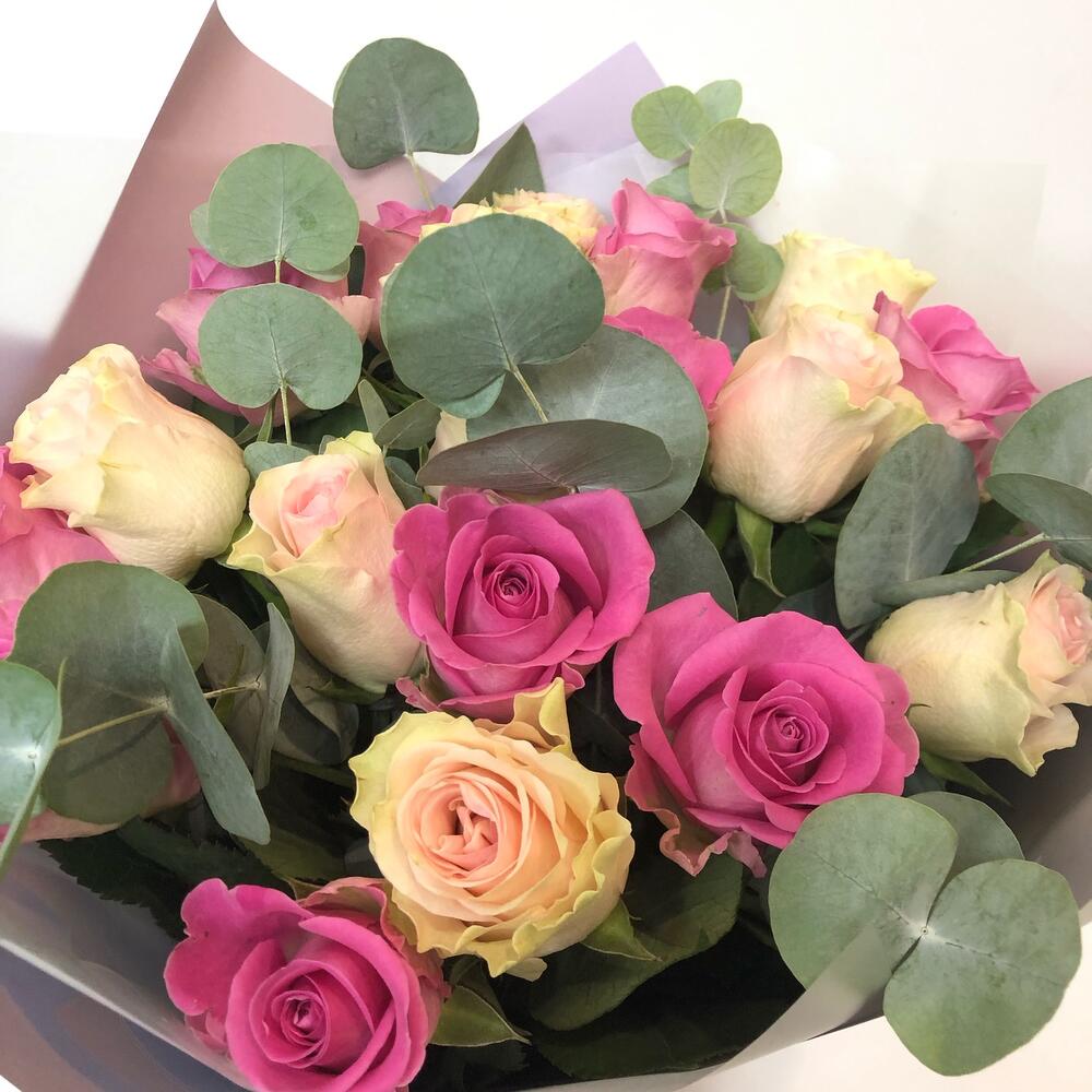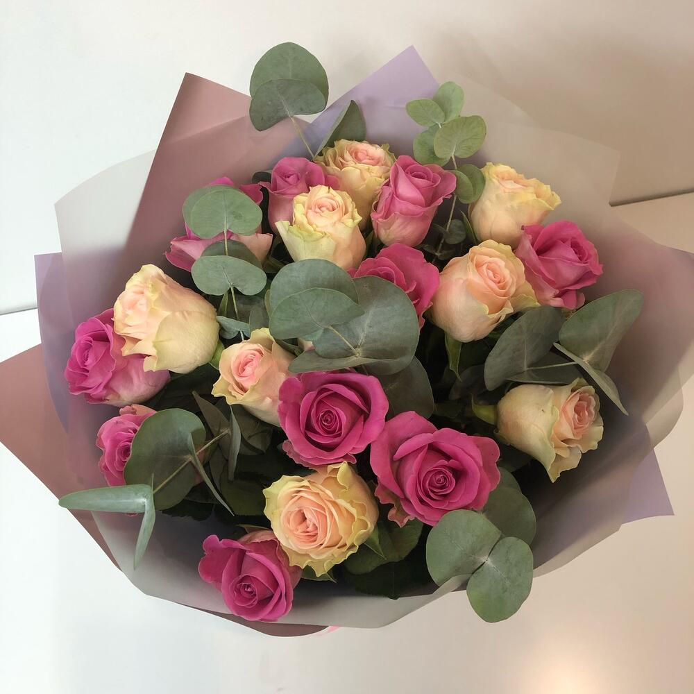 Роза – 19 шт.Эвкалипт – 3 шт.Пленка матовая – 1 шт.