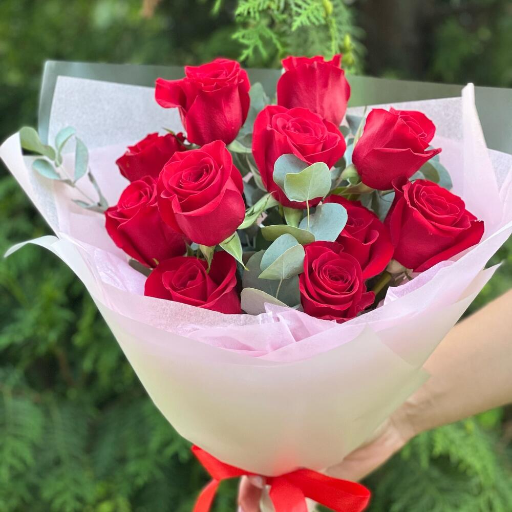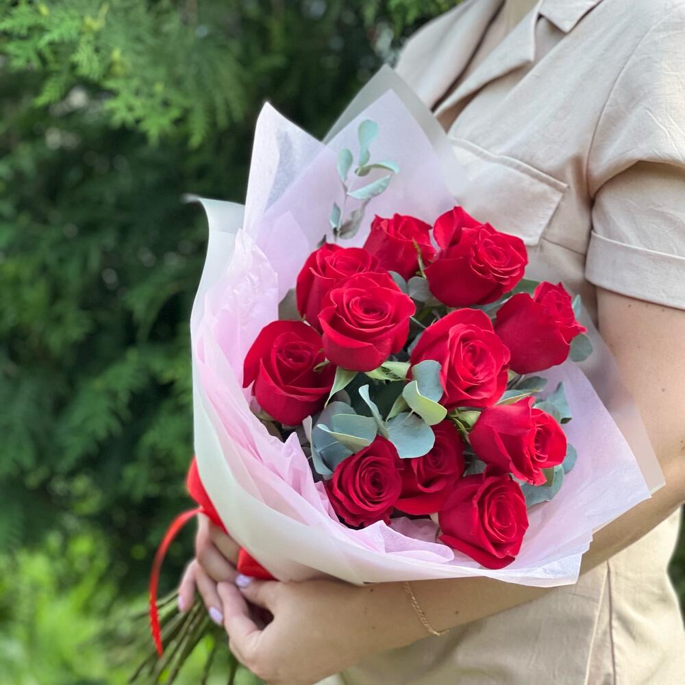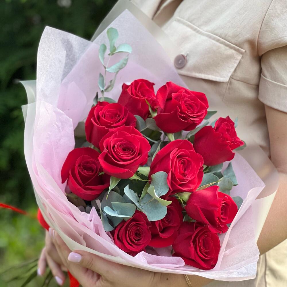Роза фридом 50 см – 11 шт.Эвкалипт – 3 шт.Дизайнерская упаковка – 2 шт.