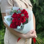 Роза фридом 50 см – 9 шт.эвкклипт – 3 шт.Тишью – 1 шт.Дизайнерская упаковка – 1 шт.