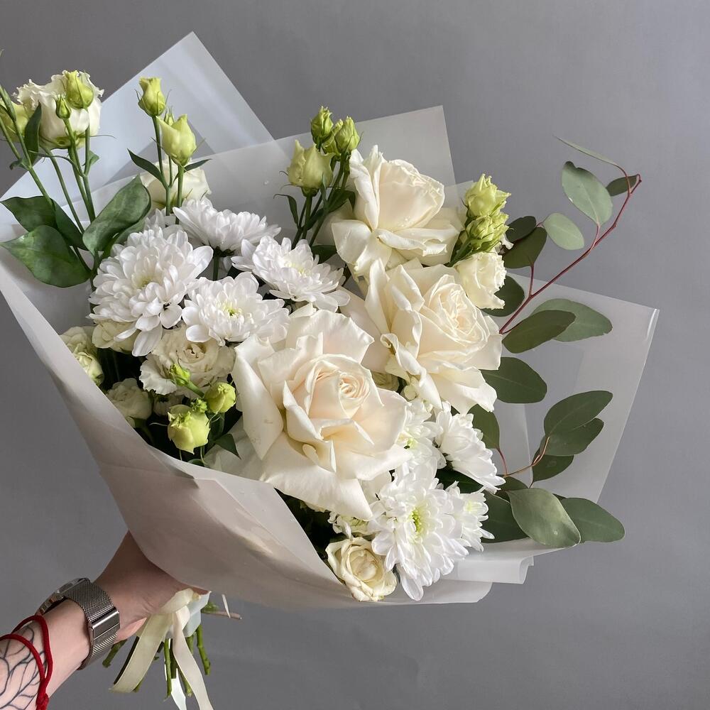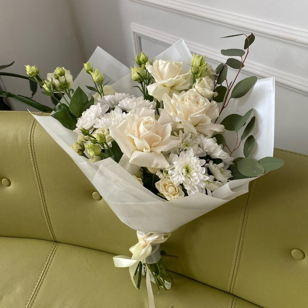 Хризантема кустовая – 2 шт.Эвкалипт – 1 шт.Кустовая роза – 2 шт.Роза белая – 3 шт.эустома белая – 2 шт.
