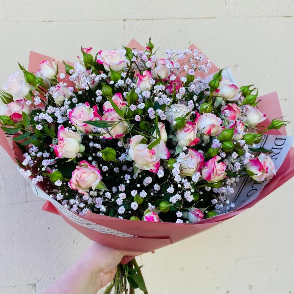 Лента – 1 шт.Роза кустовая – 5 шт.Упаковка – 1 шт.Гипсофила розовая – 1 шт.зелень декоративная – 2 шт.