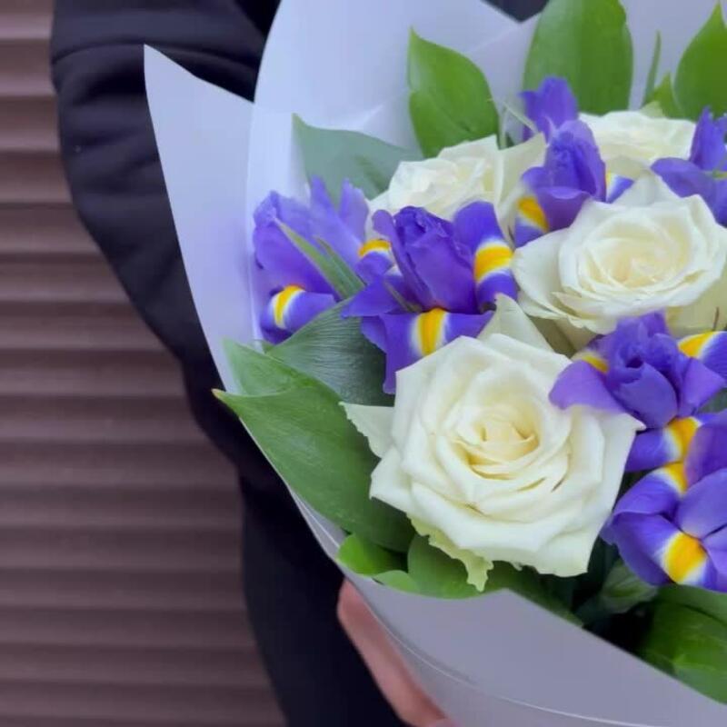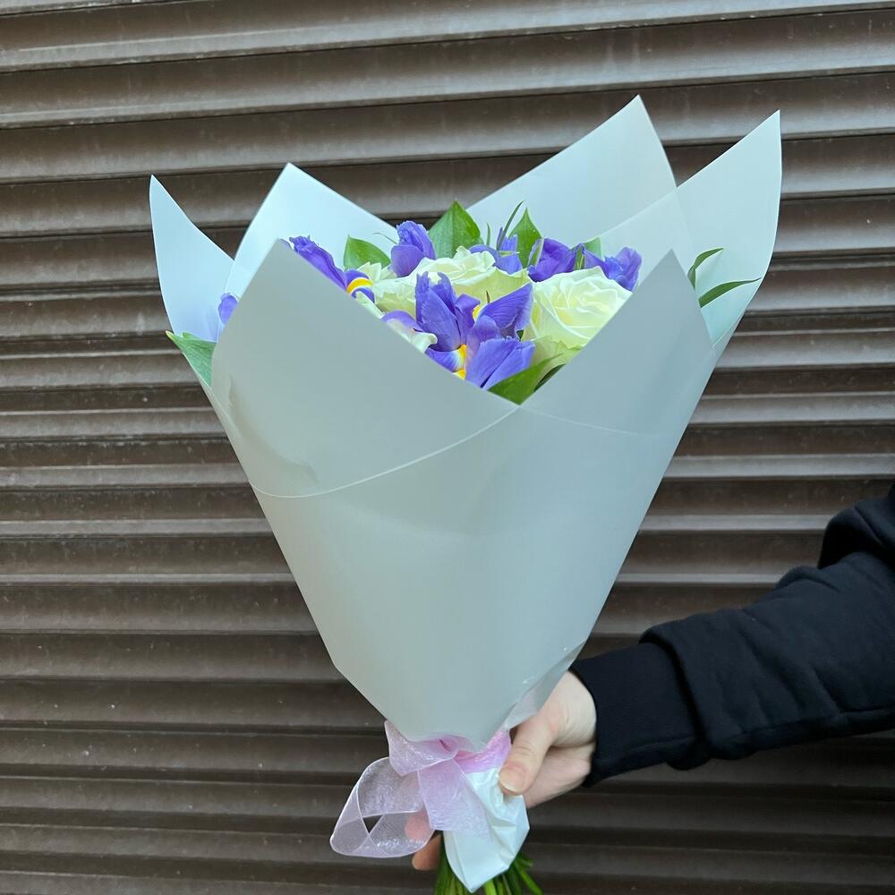 Ирис – 8 шт.Зелень – 8 шт.Роза белая – 5 шт.корея пленка – 1 шт.