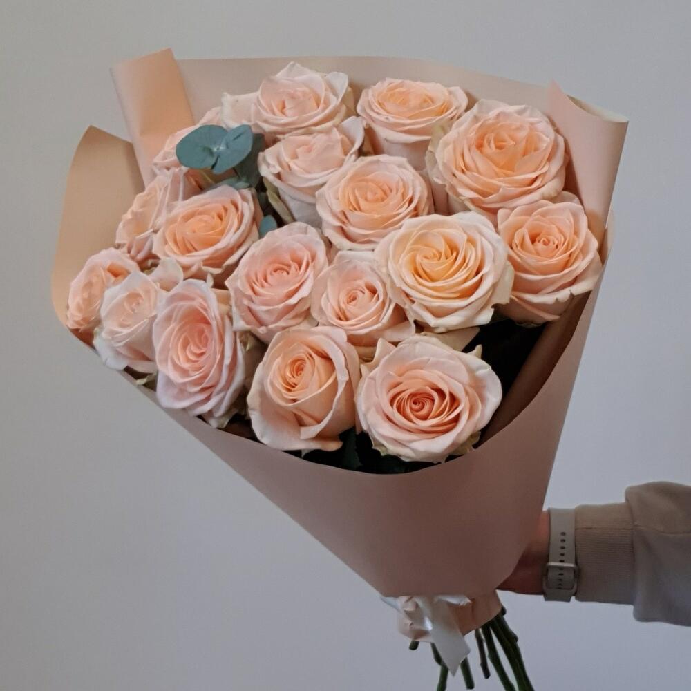 Эвкалипт – 1 шт.Упаковка – 2 шт.Лента атласная – 1 шт.Роза тиффани – 17 шт.