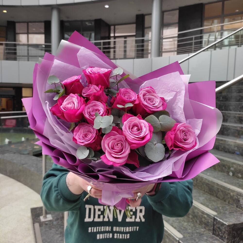Роза – 11 шт.Эвкалипт – 1 шт.Лента – 2 шт.Упаковка дизайнерская – 2 шт.