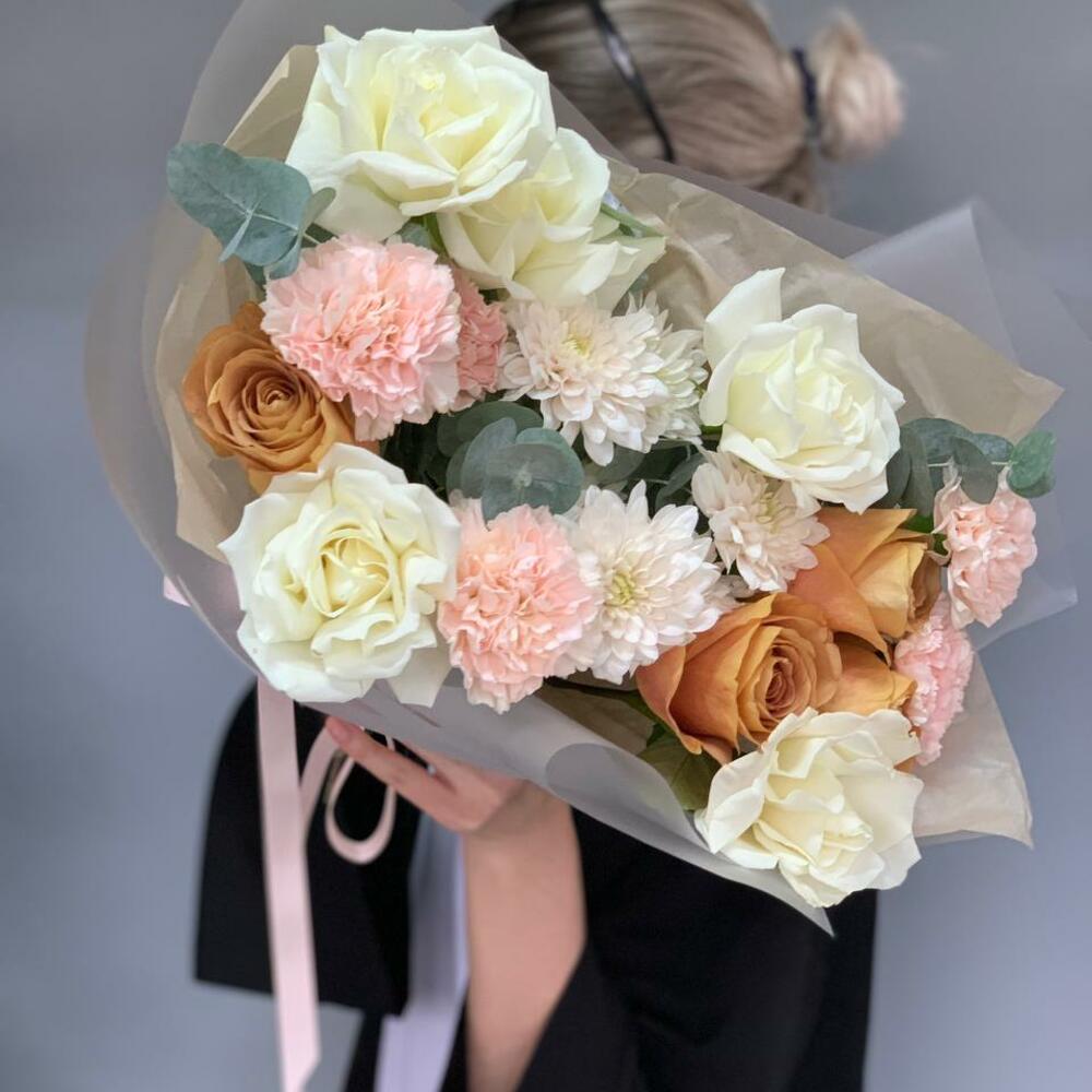 Альстромерии, Кустовые розы, Лизиантусы, Пионовидные розы, Розы, Ромашки