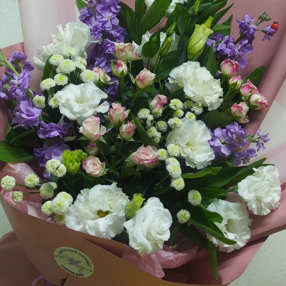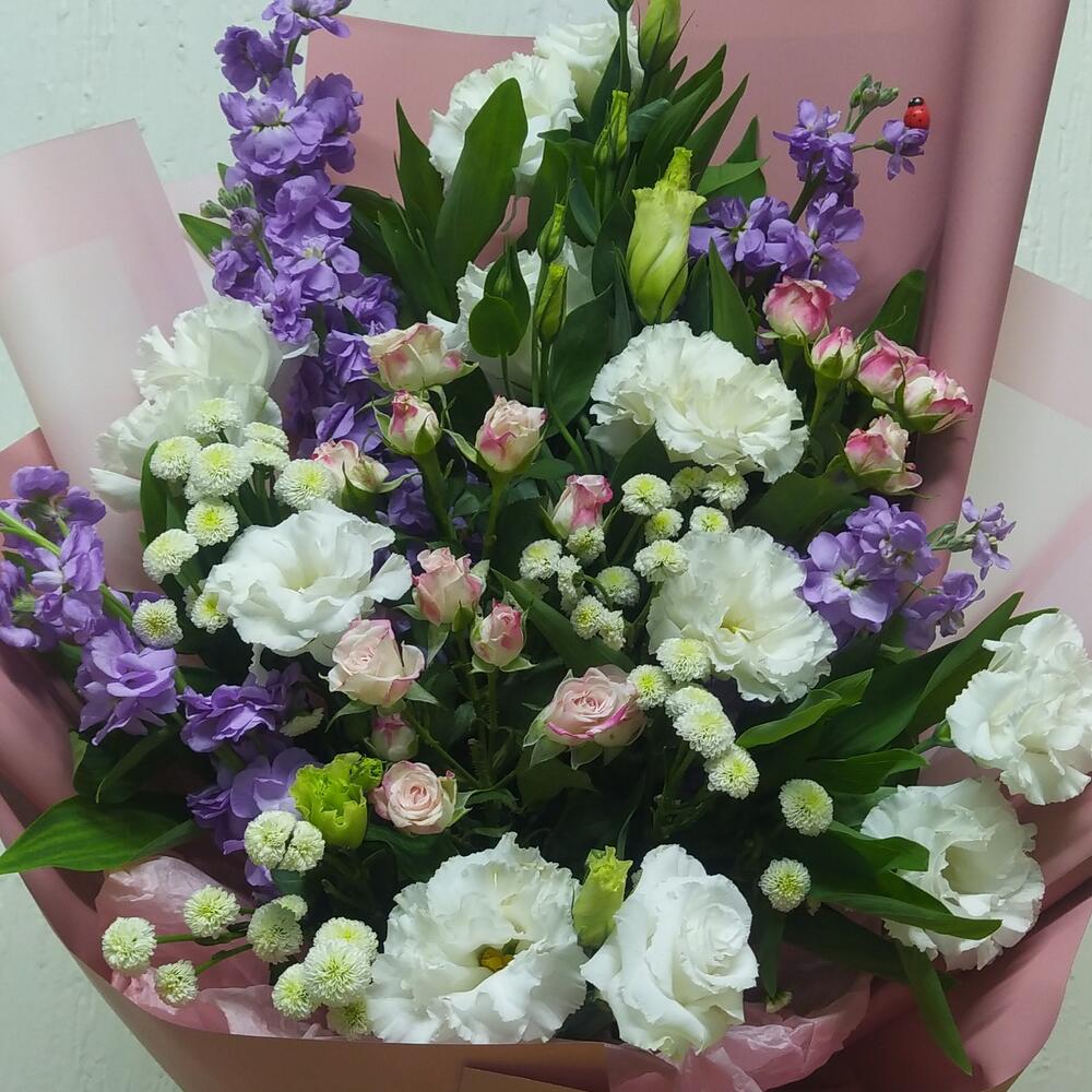Кустовая роза – 3 шт. маттиола лиловая – 5 шт. Лизиантус Алиса белый – 5 шт.