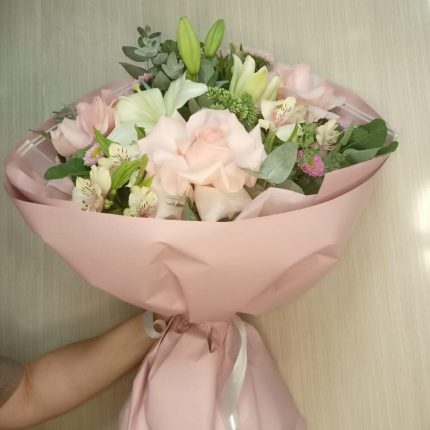 Букет состоит из лотоса и роз. Лотос символизирует чистоту и духовное просветление своими нежными лепестками и уникальной формой, а розы приносят романтику и красоту своими изящными цветами. Это сочетание создает букет, который воплощает гармонию и элегантность, принося радость и восхищение своей утонченностью.
