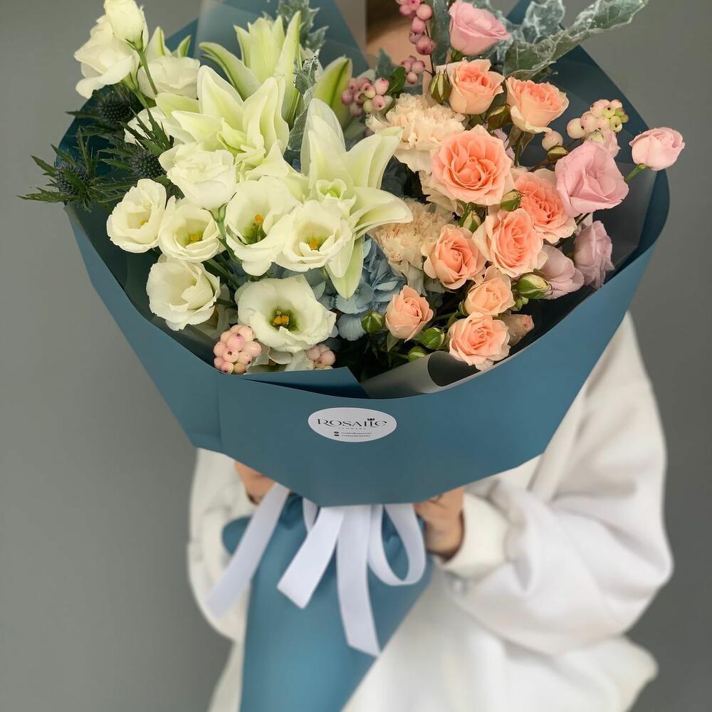 Альстромерии, Гвоздики, Кустовые розы, Лизиантусы, Розы, Хризантемы