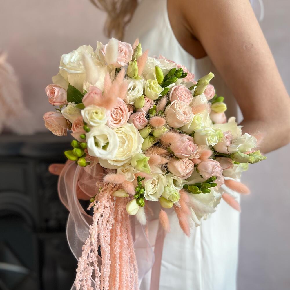 Пионовидная роза – 5 шт.Кустовая пионовидная роза – 11 шт.Лизиантус – 5 шт.фрезии – 5 шт.Лагурус – 30 шт.амарант стабилизированный – 1 шт.Лента атласная – 3 шт.