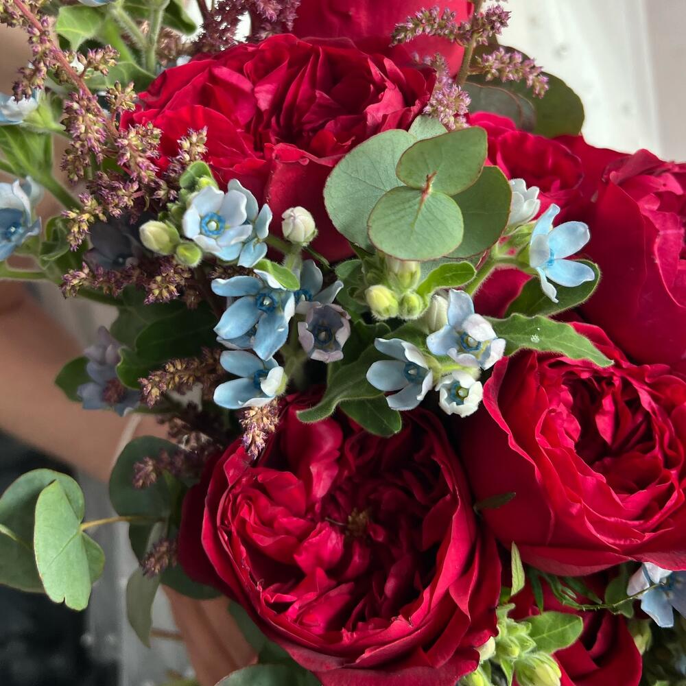 Астильба – 5 шт.Эвкалипт – 5 шт.Пионовидная роза – 9 шт.Атласная лента – 2 шт.Оксипеталум – 7 шт.
