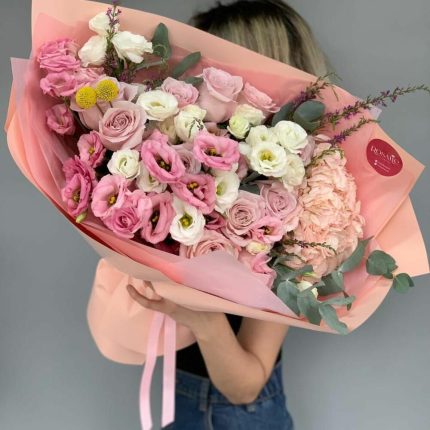 Альстромерии, Гвоздики, Кустовые розы, Лизиантусы, Розы, Хризантемы