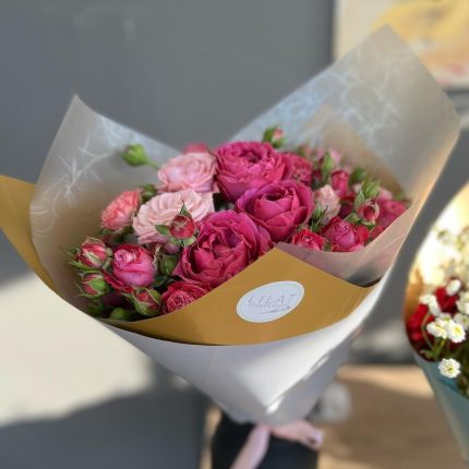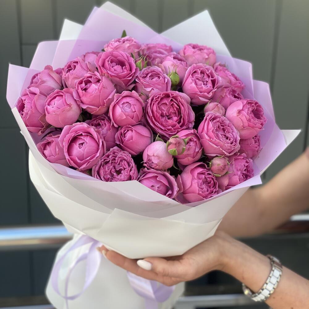 Упаковка дизайнерская – 1 шт. Открыточка с вашими пожеланиями – 1 шт. кустовая пионовидная роза misty bubbles – 9 шт.