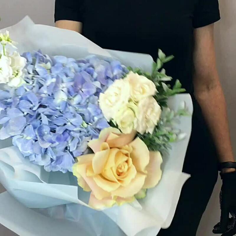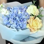 Маттиола – 1 шт.Кустовая роза – 1 шт.Лента атласная – 1 шт.Фисташка – 2 шт.Гортензия голубая – 1 шт.роза шарман – 1 шт.