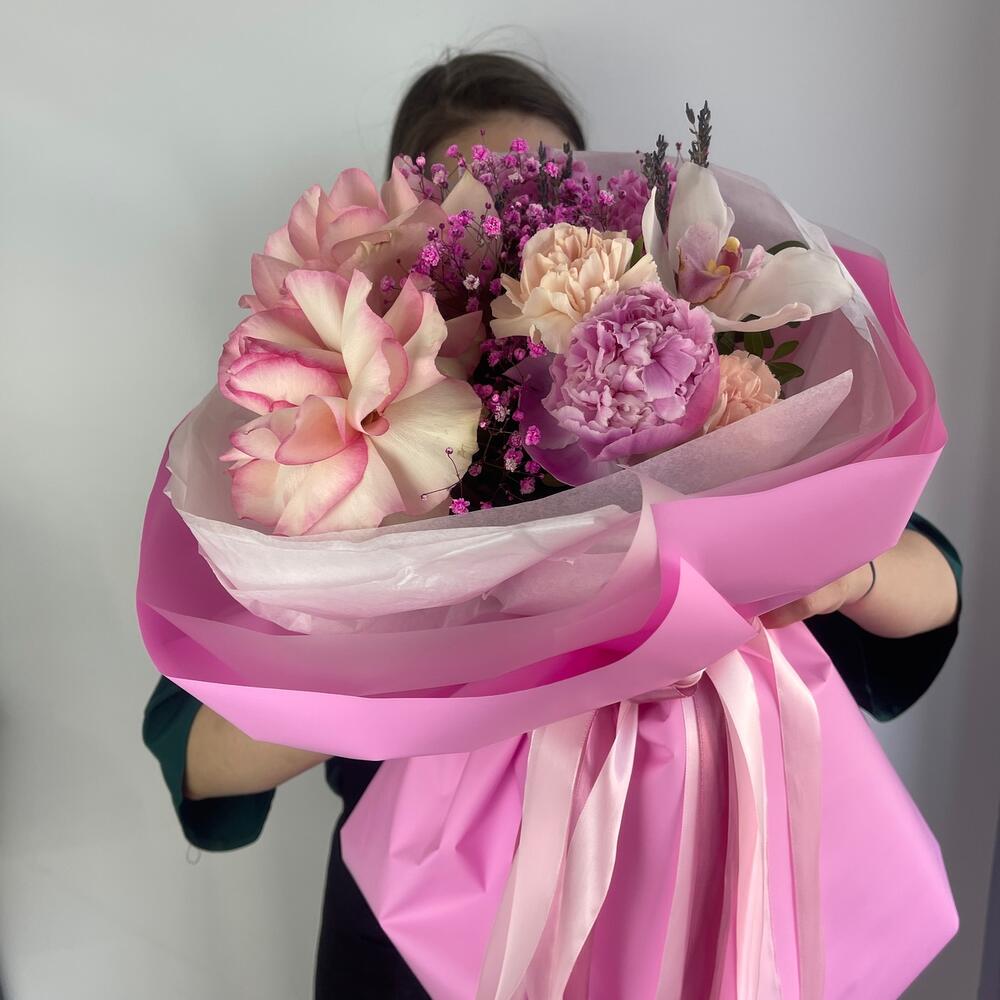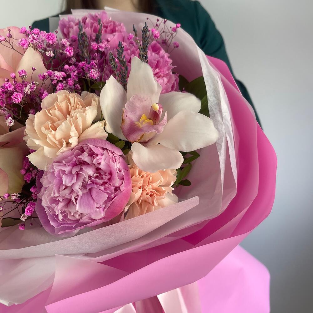 Гипсофила – 1 шт.Лаванда (сухоцвет) – 10 шт.Орхидея Цимбидиум – 1 шт.Пион – 3 шт.Диантус – 2 шт.Салал листья – 4 шт.Роза французская – 2 шт.