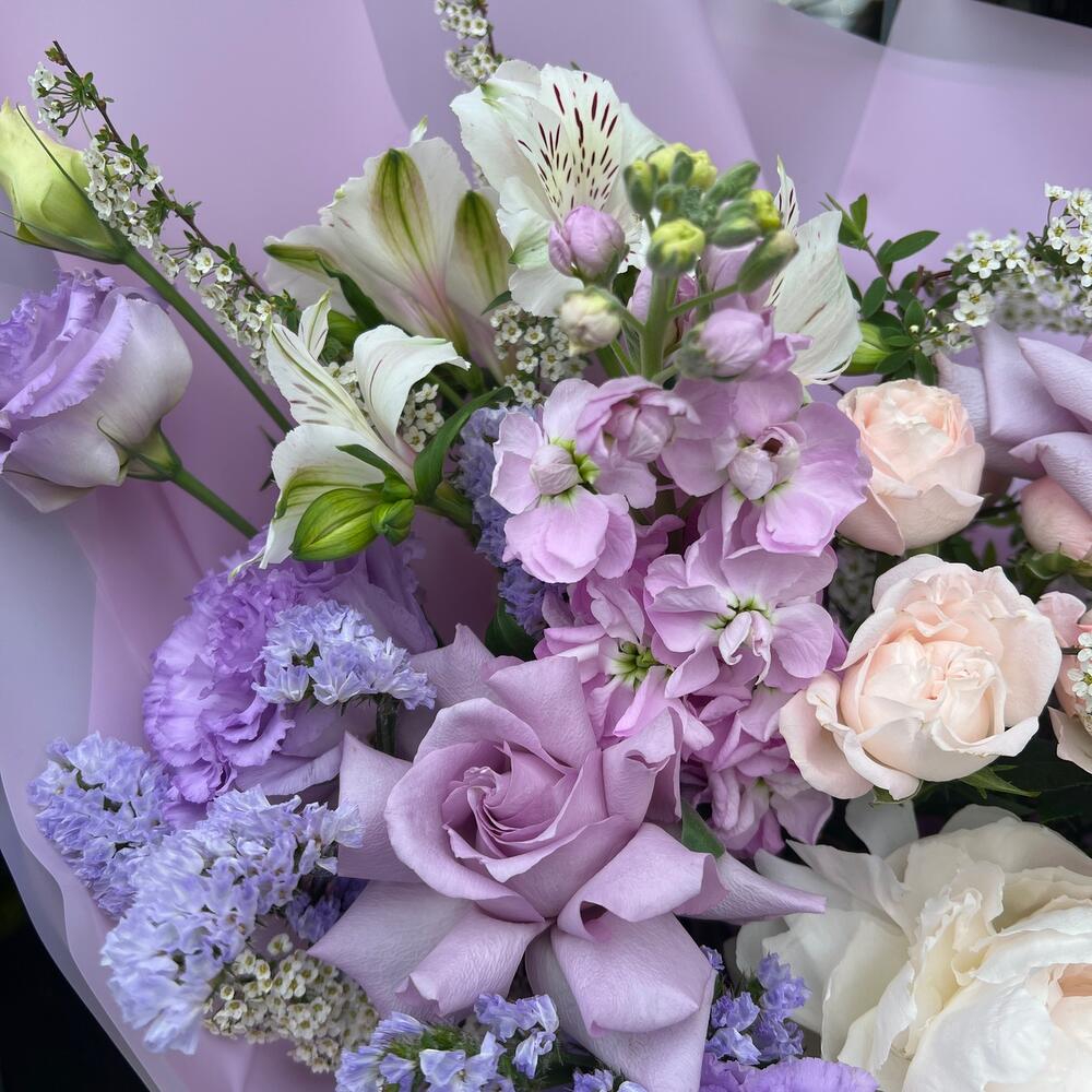 Альстромерия – 2 шт.Лизиантус – 4 шт.Маттиола – 2 шт.Пион – 1 шт.Роза – 3 шт.Кустовая роза – 2 шт.Атласная лента – 1 шт.декоративная упаковка – 1 шт.спирея ветка – 3 шт.