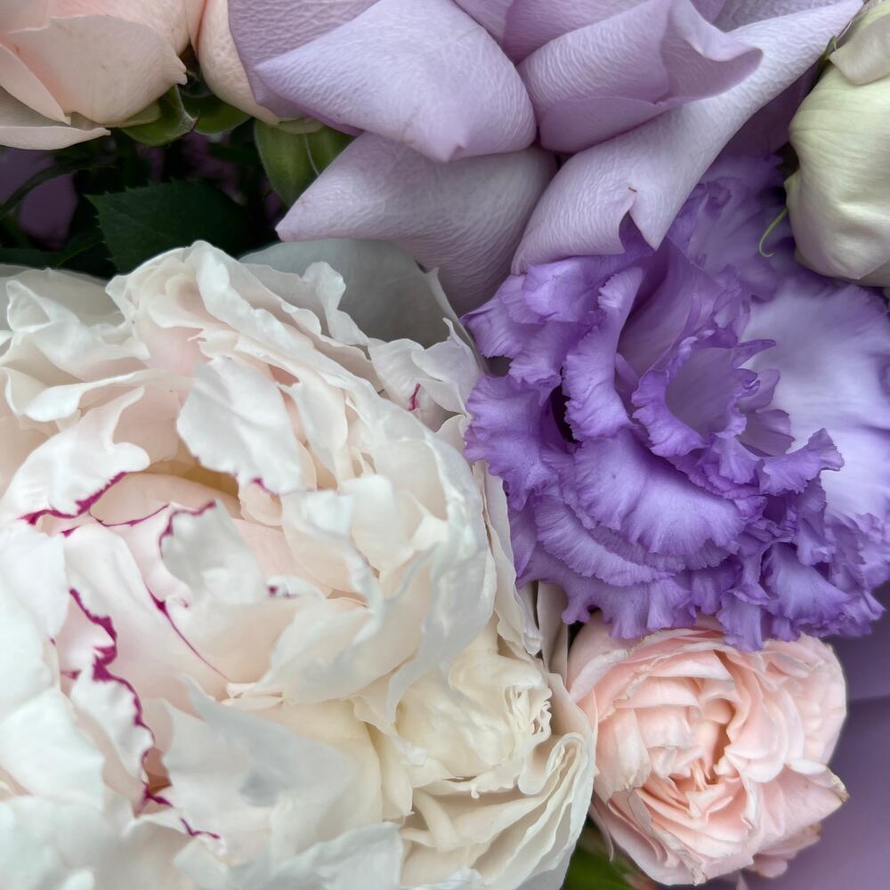 Букет с пионом, маттиолой, розой и эустомой «Счастье»