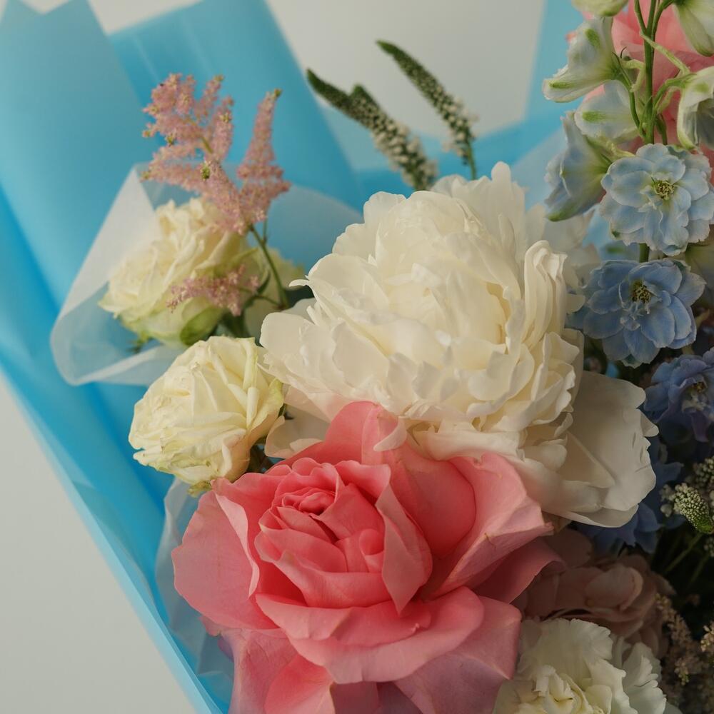 Пион – 1 шт.Гортензия – 1 шт.Астильба – 3 шт.Вероника – 2 шт.Диантус – 3 шт.Роза французская – 3 шт.Дельфиниум – 2 шт.Упаковка дизайнерская – 1 шт.