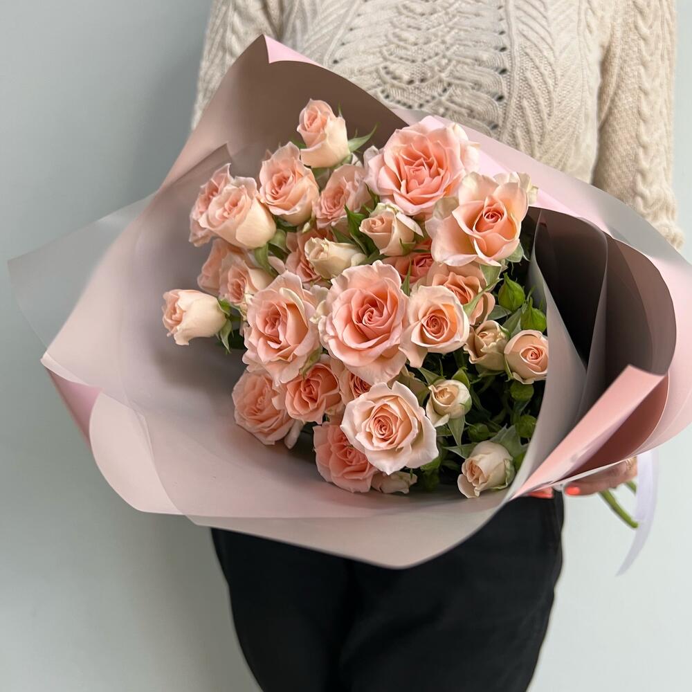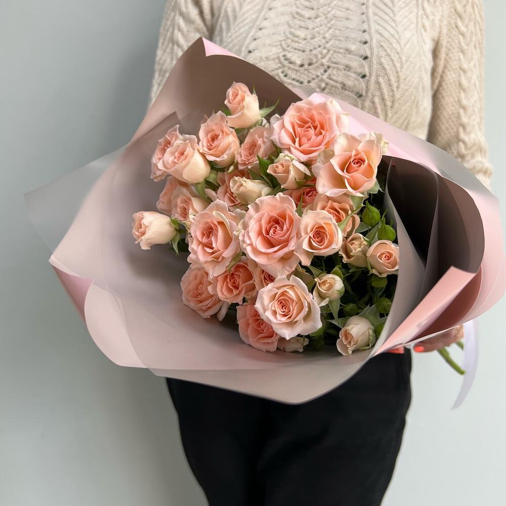 Кустовая роза – 5 шт.Лента атласная – 1 шт.Упаковка дизайнерская – 3 шт.