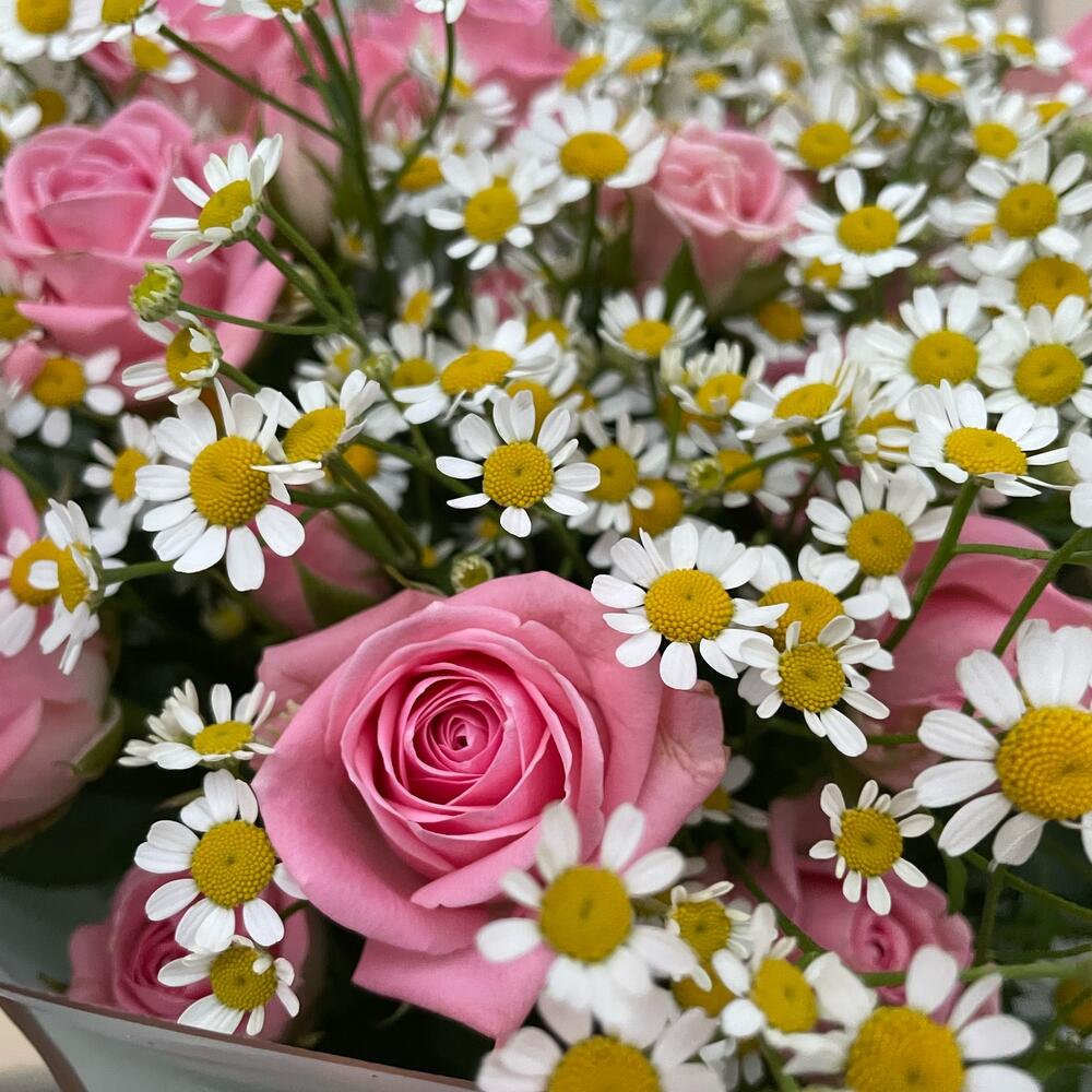 Роза кустовая – 5 шт.Матрикария – 10 шт.Упаковка дизайнерская – 3 шт.