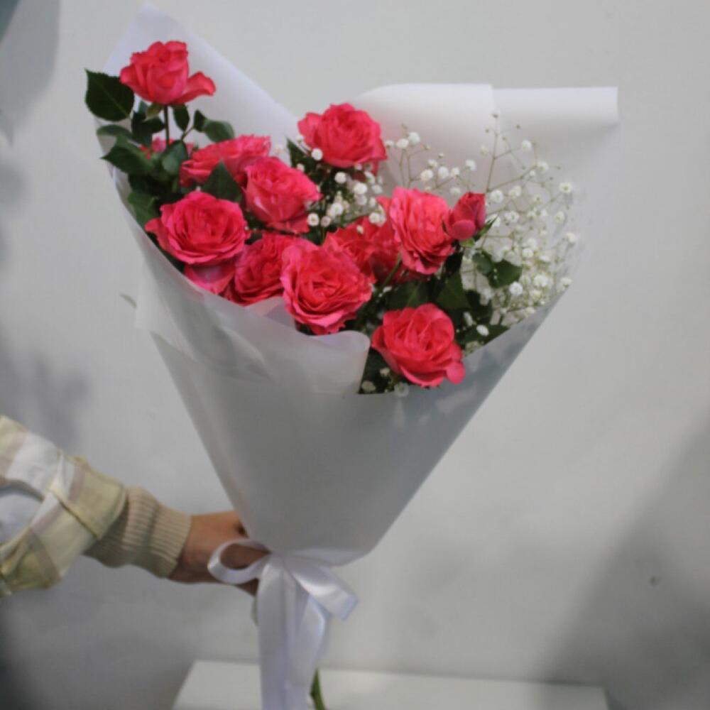 Упаковка дизайнерская – 1 шт.роза кустовая премиум – 3 шт.веточка гипсофилы – 1 шт.