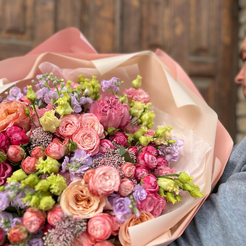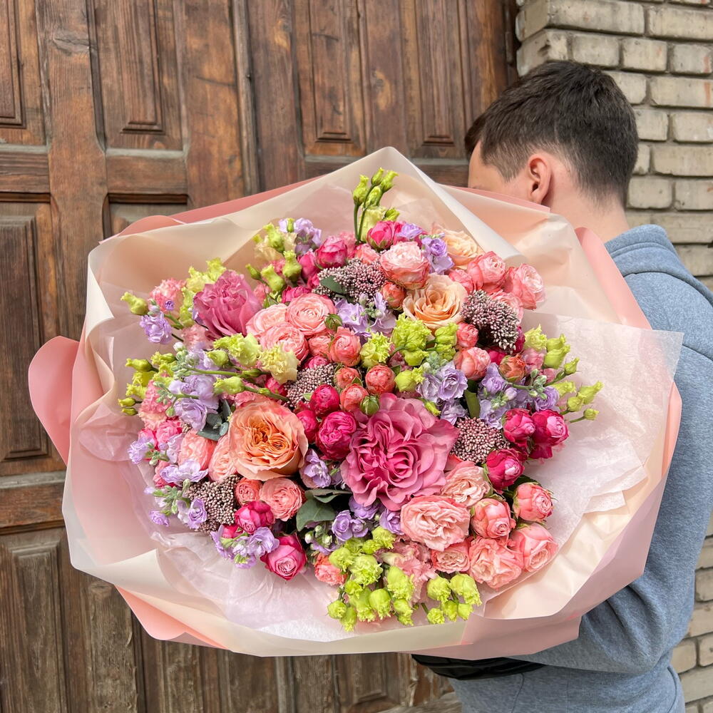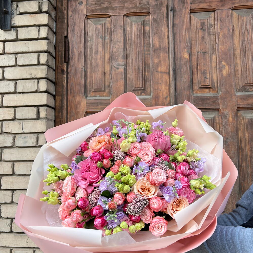 Альстромерии, Гвоздики, Кустовые розы, Лизиантусы, Розы, Хризантемы