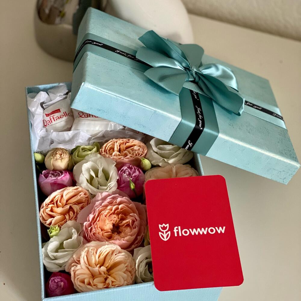 Аккуратная коробочка из цветов и вкусных конфет с кокосовой начинкой. Цветы помещены в специальную губку, поэтому не требуют никакого специального ухода. По вашему желанию и за небольшую доплату можем заменить конфеты на любимые получателя. Сообщите о намерении при заказе