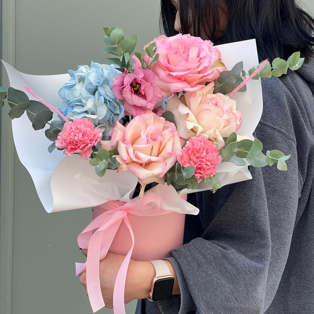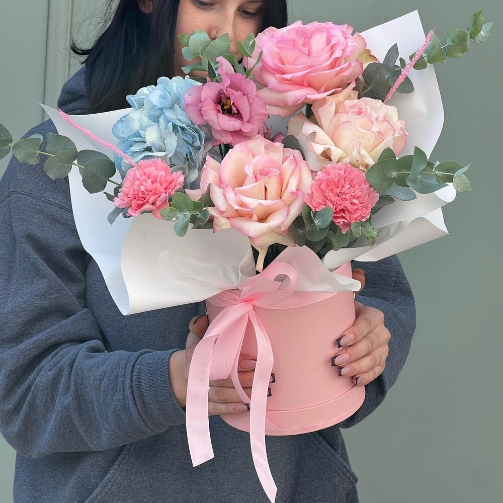 Альстромерии, Гортензии, Кустовые розы, Лизиантусы, Розы, Хризантемы