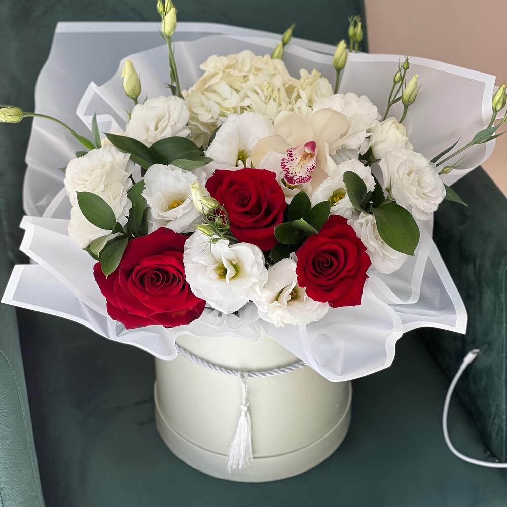Альстромерии, Гвоздики, Кустовые розы, Лизиантусы, Розы, Хризантемы