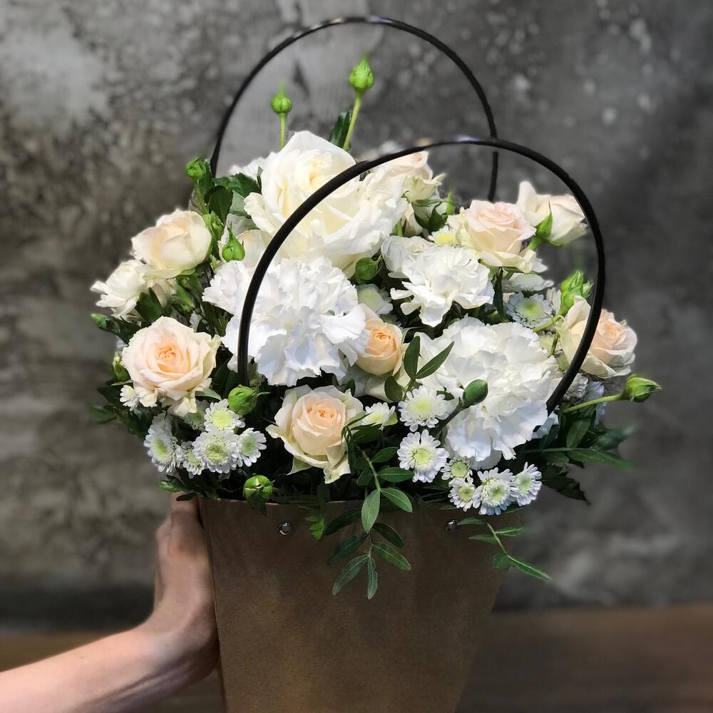 Роза кустовая – 2 шт.Гвоздика – 2 шт.Гвоздика кустовая – 3 шт.Хризантема сталион – 2 шт.Фисташка пучок – 1 шт.сумка крафт с ручками – 1 шт.Оазис флористический – 1 шт.
