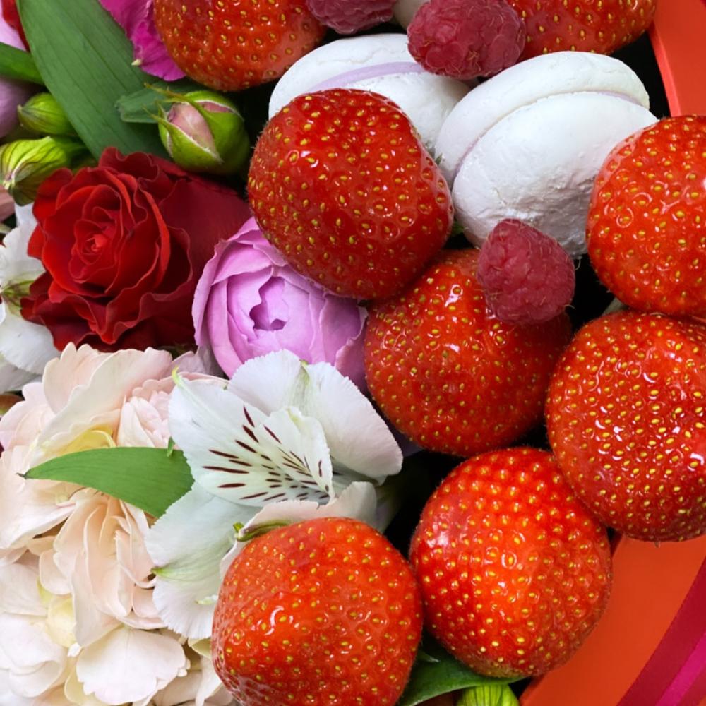 Шикарная композиция из любимых цветов с ароматной клубникой и вкусными пирожными!Смотрится эффектно! ❤️❤️❤️