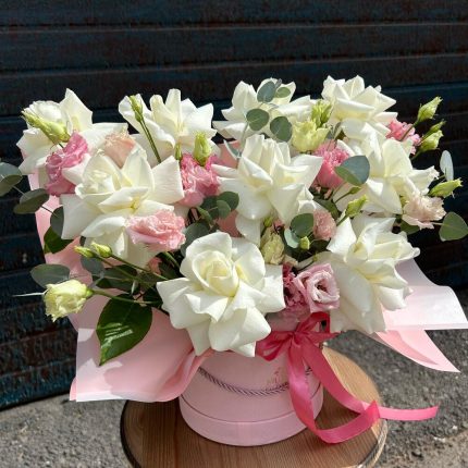 “Атлас☁️” – цветочная композиция с зефиром в деревянном ящике