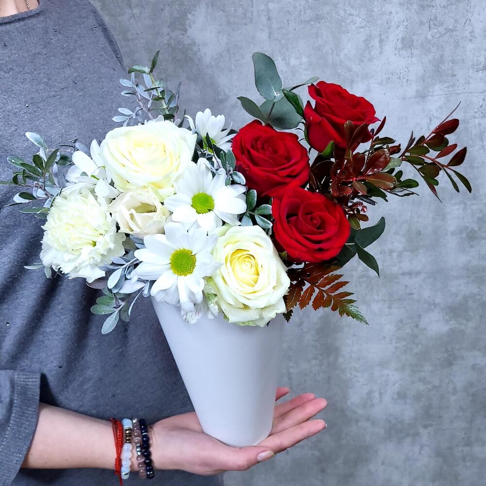 Хризантема кустовая – 1 шт.Роза – 5 шт.Гвоздика – 1 шт.Фисташка – 1 шт.Шляпная коробка – 1 шт.Оазис флористический – 1 шт.