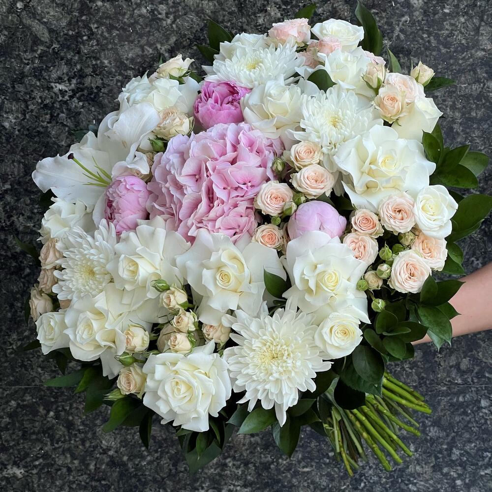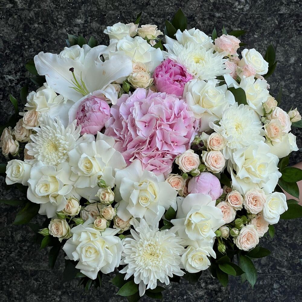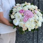 Корзина с пионами,маттиолой и пионовидными розами