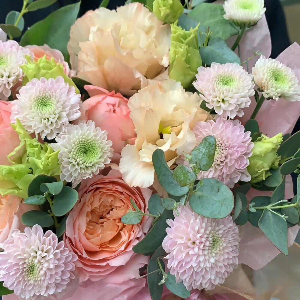 Композиция из пионовидных роз, кустовых хризантем и эвкалипта
