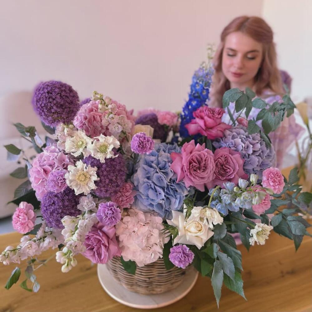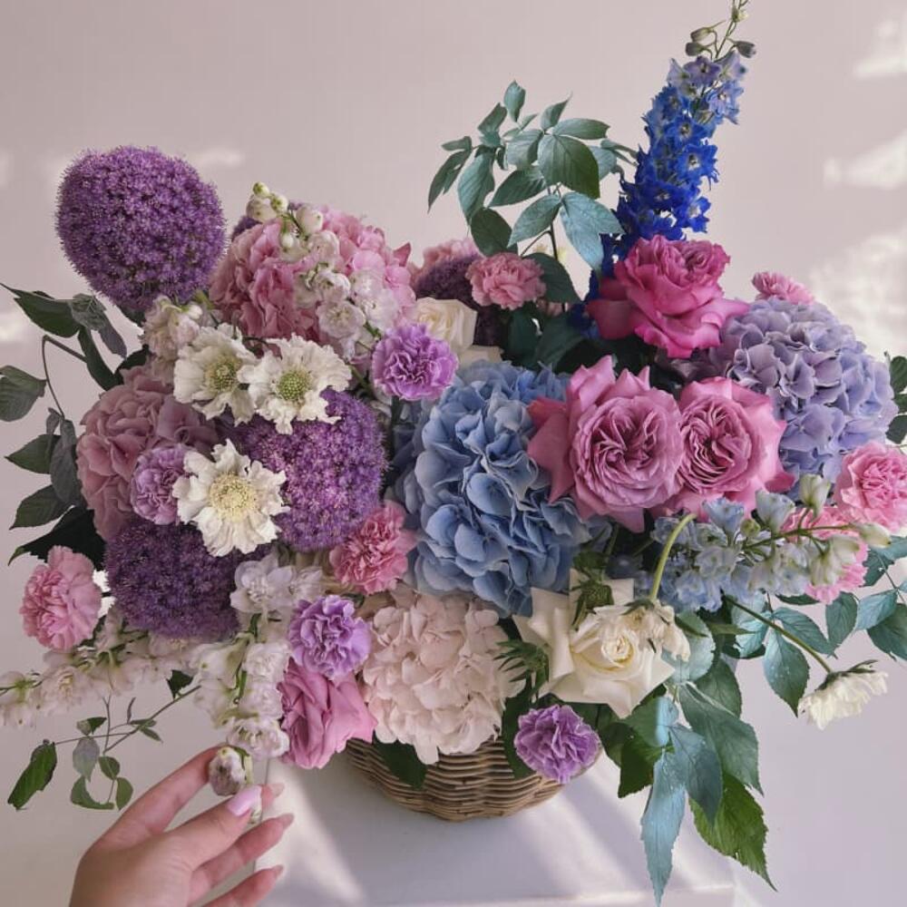 Гортензия – 5 шт.Аллиум – 3 шт.Дельфиниум – 3 шт.Пионовидная роза – 15 шт.Лунная гвоздика – 15 шт.